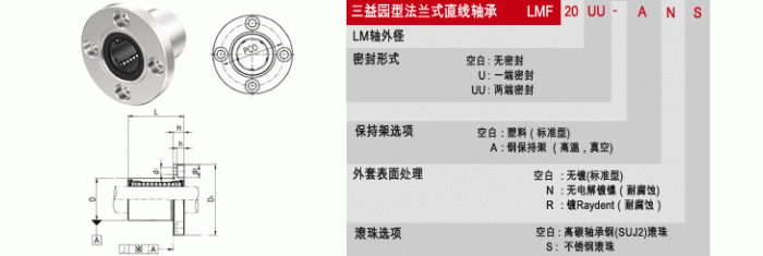 注1) 对额定动载荷 C:额定寿命50Km时 C100 :额定寿命100Km时, C100 = C/1.26 例)LM12 C:410N, C100 = 410/1.26 = 325.40N 2) 表中重量是塑料保持架轴承的 3) 主要尺寸是㎜ |